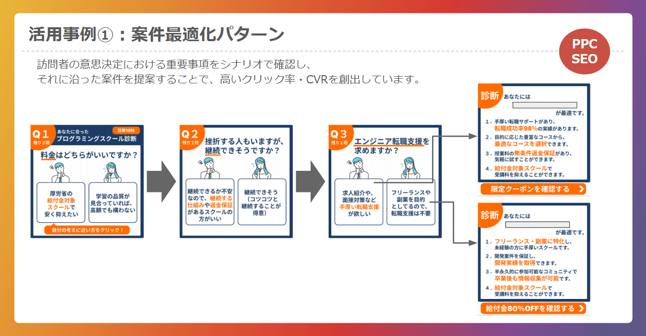 ユーザーの意思決定における重要事項をシナリオで確認し、それに合う案件を提案することで、CVRとクリック率の向上が期待できます。