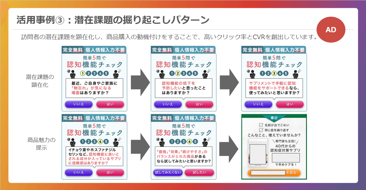 ユーザーの悩みを具体化し、比較検討を促進することで、従来のポップアップと比較して7.6倍のクリック率を達成しています。