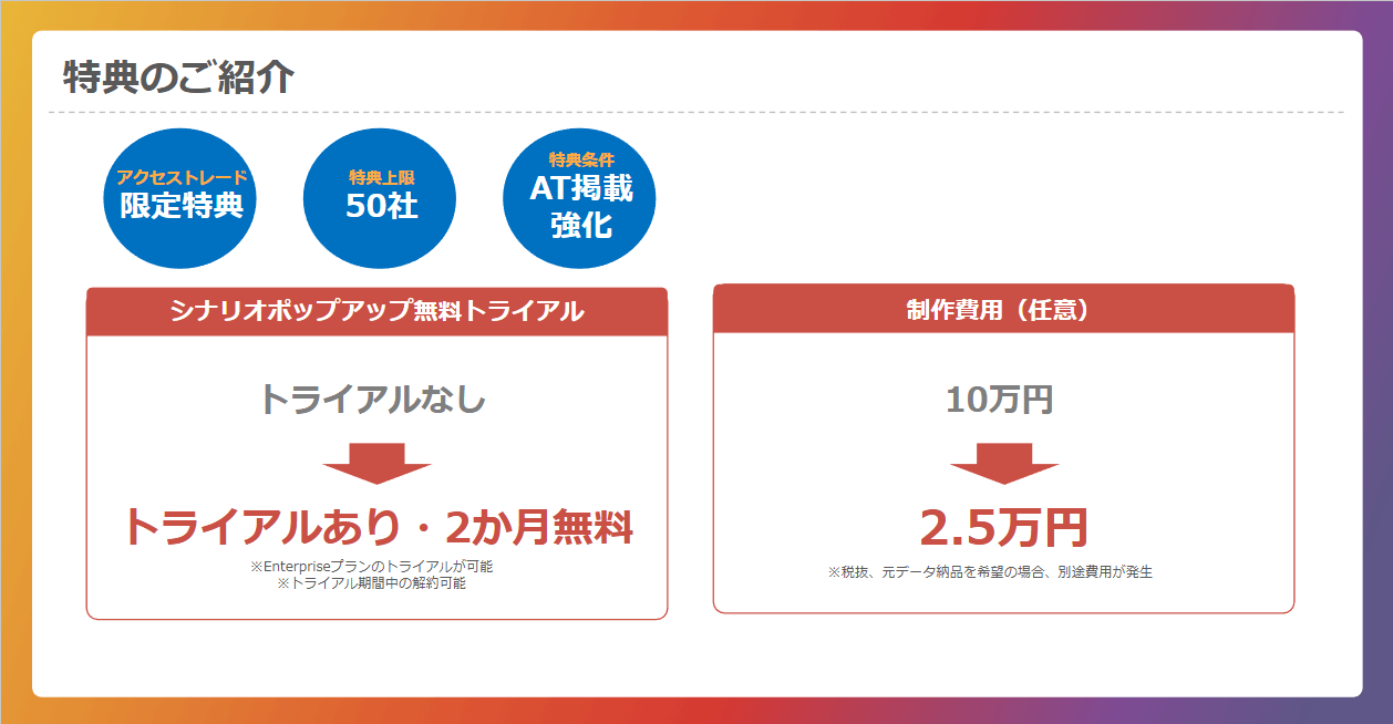 サイトリードの特典を利用すると、2ヶ月無料でシナリオポップアップの使用感や効果を試せます。