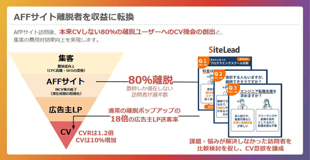 サイトリードに搭載されているシナリオポップアップでは、通常の離脱ポップアップと比較して、18倍の広告主LP送客率を達成しています。