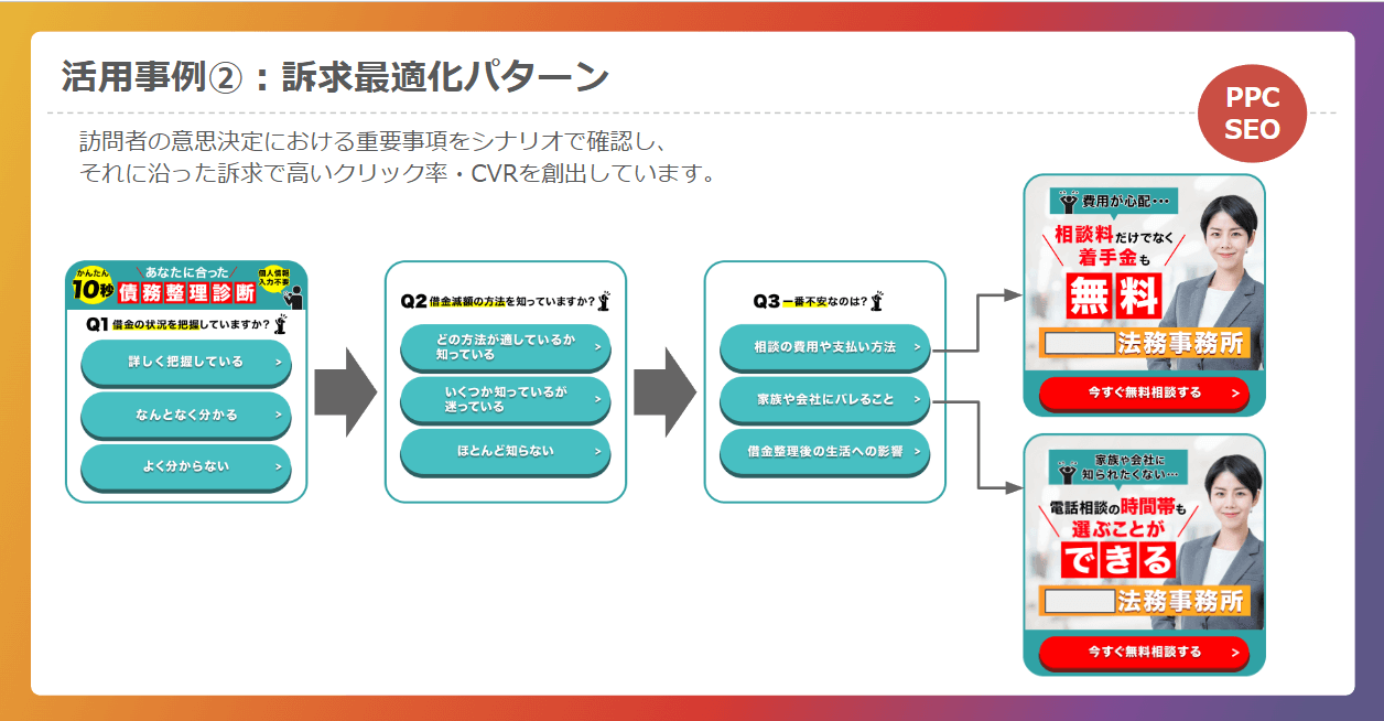 ユーザーの意思決定における重要事項をシナリオで確認し、それに合うメッセージによる訴求でCVRとクリック率の向上を図ります。