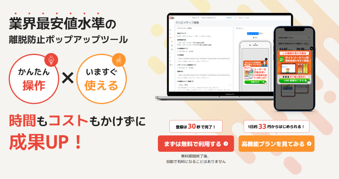 「まずはポップアップを試してみたい」という方には、無料で始められるサイトリードがおすすめです。