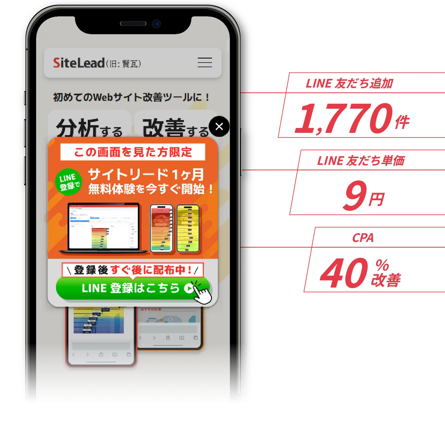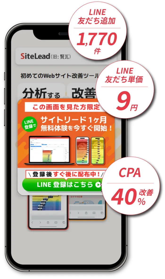 「ポップアップ入れたけど、効果がでない」といった課題に対して、サイトリードはクリエイティブ単位で効果計測とAIを用いた自動最適化が可能。クリック率・CV率・LINE友達追加率の改善が自動で完結します。